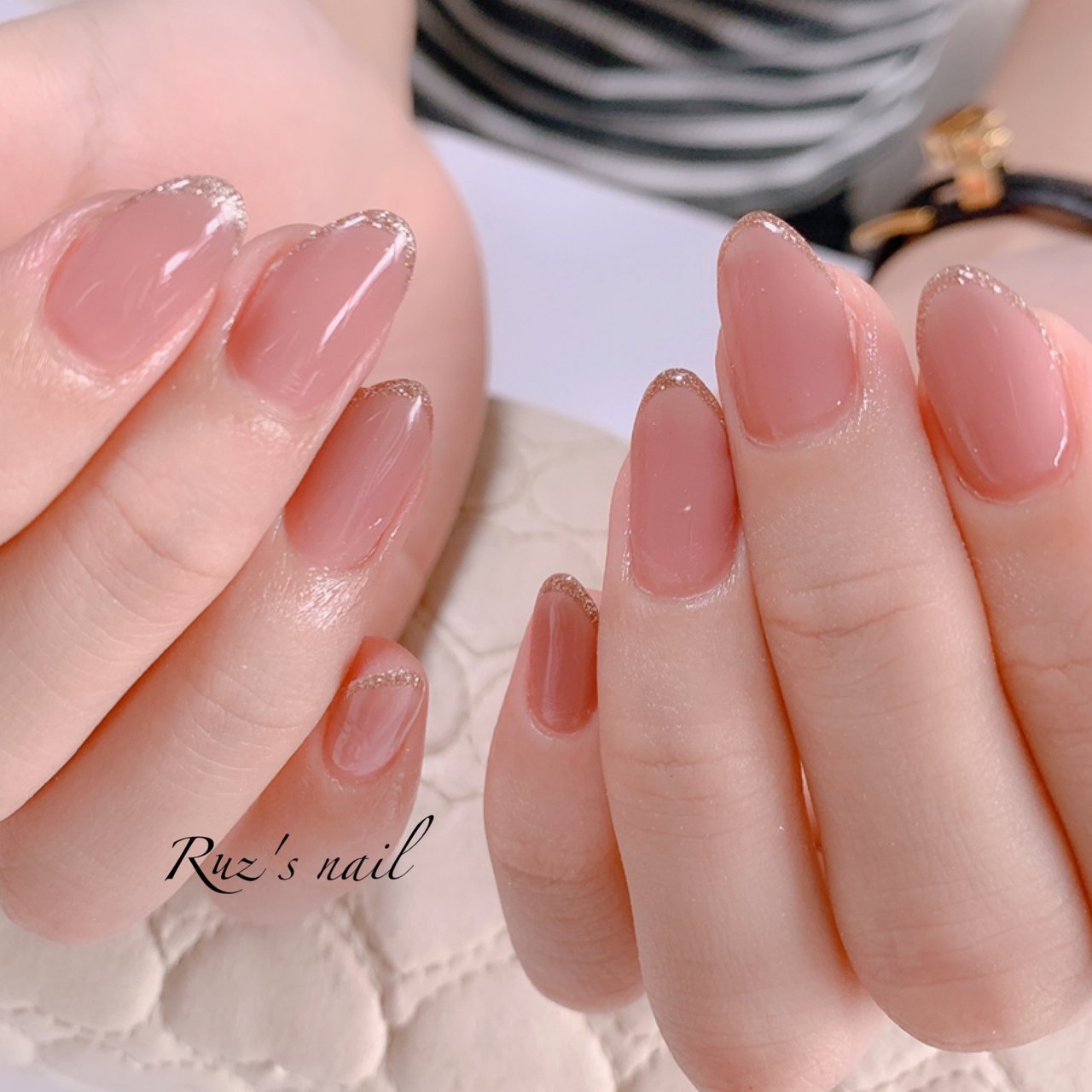 ピンクベージュネイル シンプル ヌーディカラー 先端ラメ ラメがけ ネイリスト ネイル Rkmn リ カマ ナ 所属 前川 奈未のネイル デザイン ミニモ